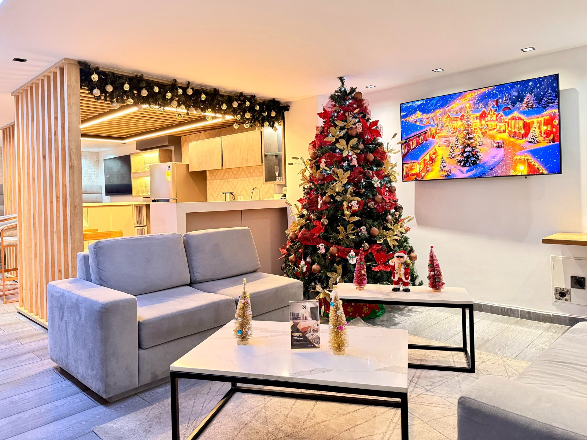 Habitaciones de 35 m2 (82. ft2) con cama tamaño King, sofá cama, TV 55", nevera minibar, mesas de noche, maletero y escritorio de trabajo, ducha de agua caliente.